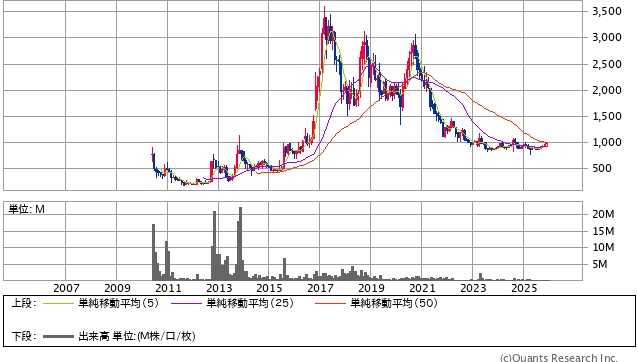 パピレスの10年チャートです。なんとか踏ん張って株価を上昇させて欲しいものですが。